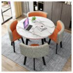 About this item ● Table and chair combination material: marble-like board + E1 high-density board + melamine moisture-proof treatment, no odor, easy to clean, table thickness 25mm. The chair is made of high-quality cotton and linen + high-density sponge filling, which has good folding fastness and breathable comfort. ● solid wood round table design: four-legged frame structure of table and chairs, solid and stable, strong carrying capacity. Rounded corners on the table prevent collisions. The legs of the table and chair are made of metal steel frame, sandblasted, and do not fade or rust. ● Dining Table and Chair Features: Using high-quality hardware accessories, it can bear 250kg / 550lb Tables and chairs are equipped with non-slip pads to prevent sliding and protect the floor. ● 1 table and 4 chairs: curved seat and proper height, natural high density sponge will make you feel relaxed when sitting on the chair. When tilted towards the human body, it adapts to the human body and supports stability and comfort. ● Suitable for various scenarios: cafe, living room, kitchen, balcony, restaurant, lounge, reception room, office, outdoor, tea house, bakery, hotel, negotiation room, bar, etc. No Description